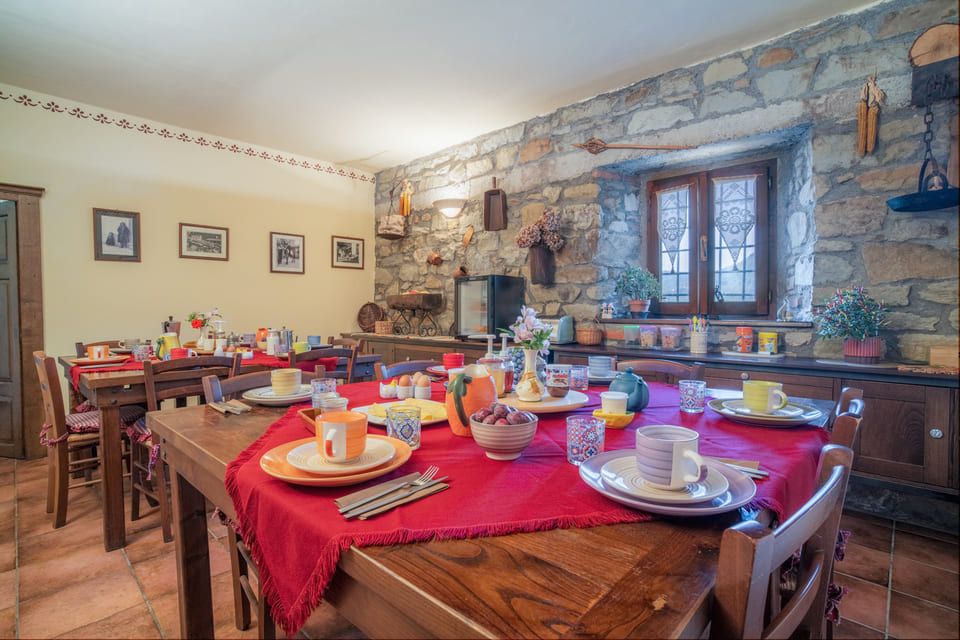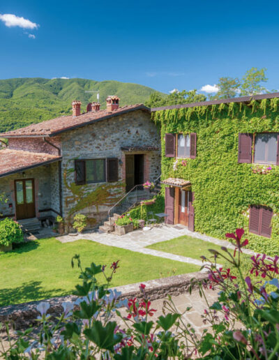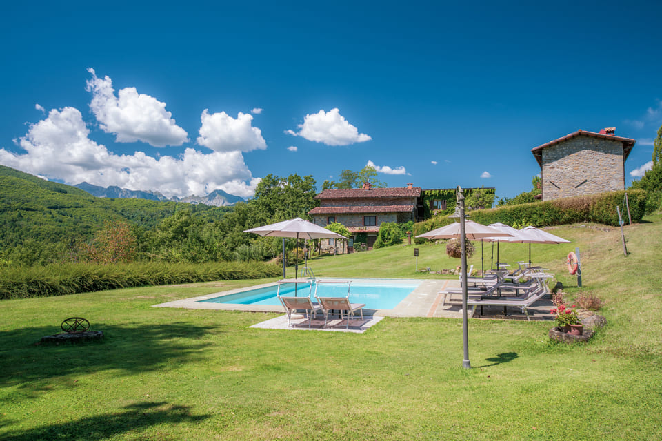 In de zomer eet je heerlijk buiten, onder een pergola van blauwe regen, met uitzicht op de noordelijke Apuaanse Alpen. Rondom de boerderij lopen honden en katten ontspannen rond, scharrelen kippen in het gras en heerst vooral rust. Dit is zo’n plek waar je vanzelf onthaast; met een boek aan het zwembad of gewoon kijkend naar het steeds veranderende licht boven de bergen.