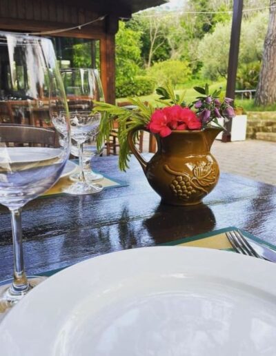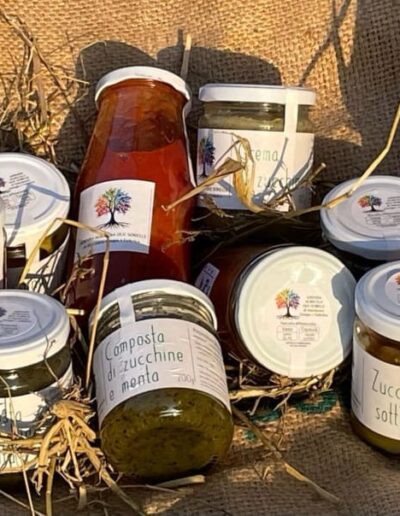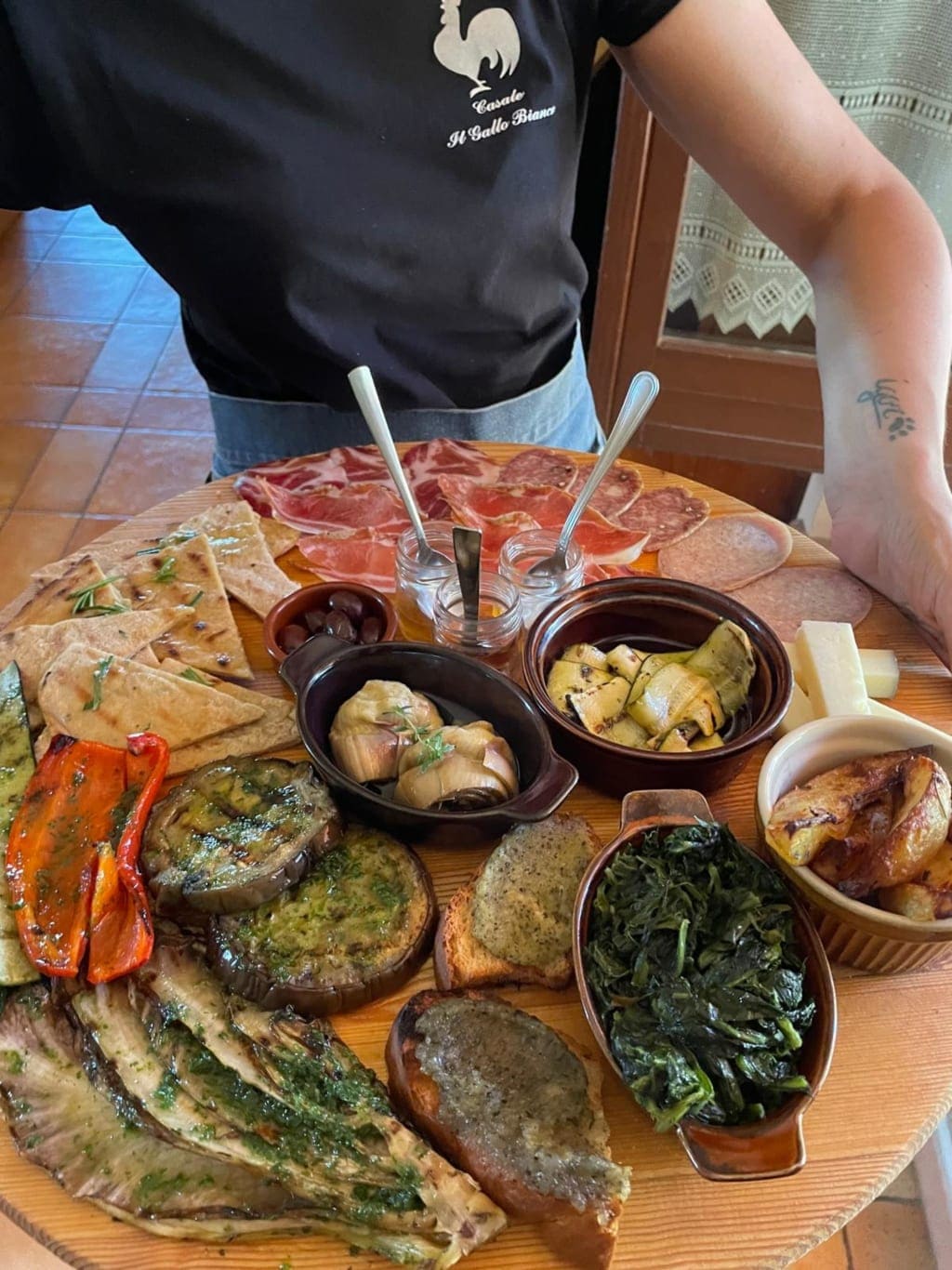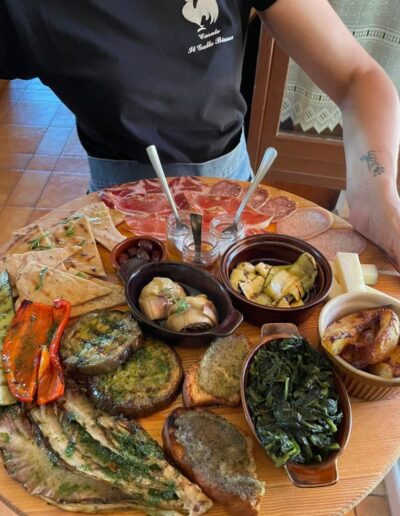 De familie produceert zelf fruit, groenten, meel en vlees, en verwerkt dat tot o.a. conserven, jam en salumi. Dat proef je terug in de keuken: huisgemaakte pasta, crescia (lokaal brood) en taarten. Gemaakt met meel van eigen boerderij.