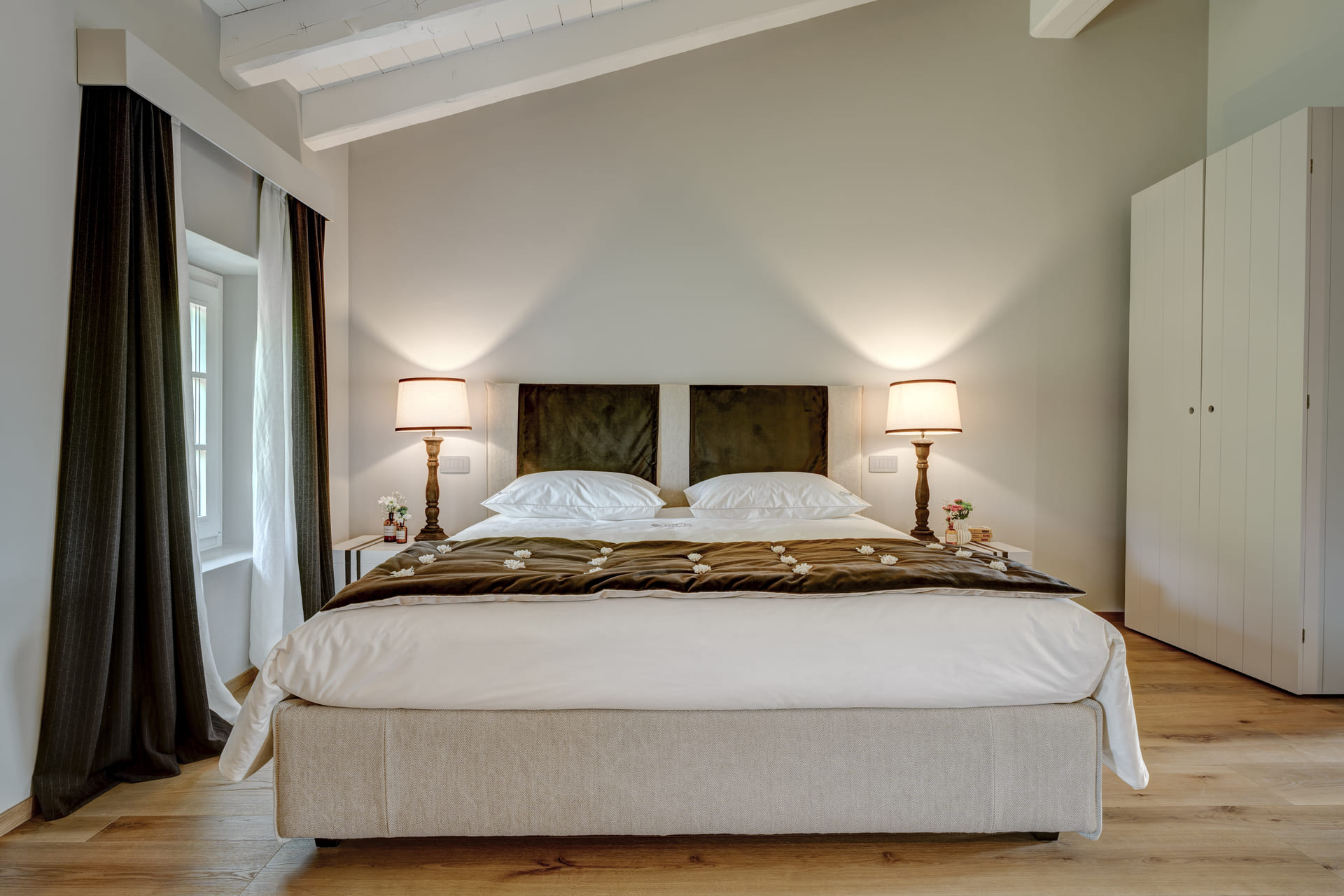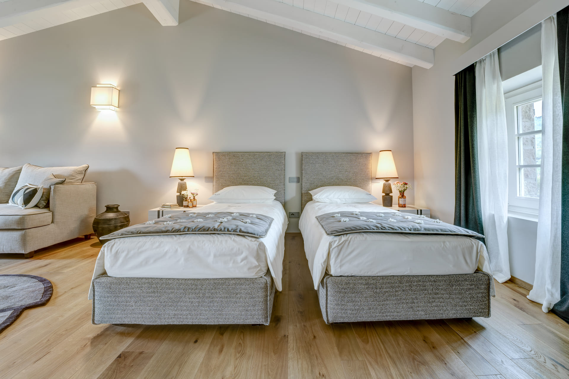De kamers en het appartement zijn warm en minimalistisch ingericht, met: