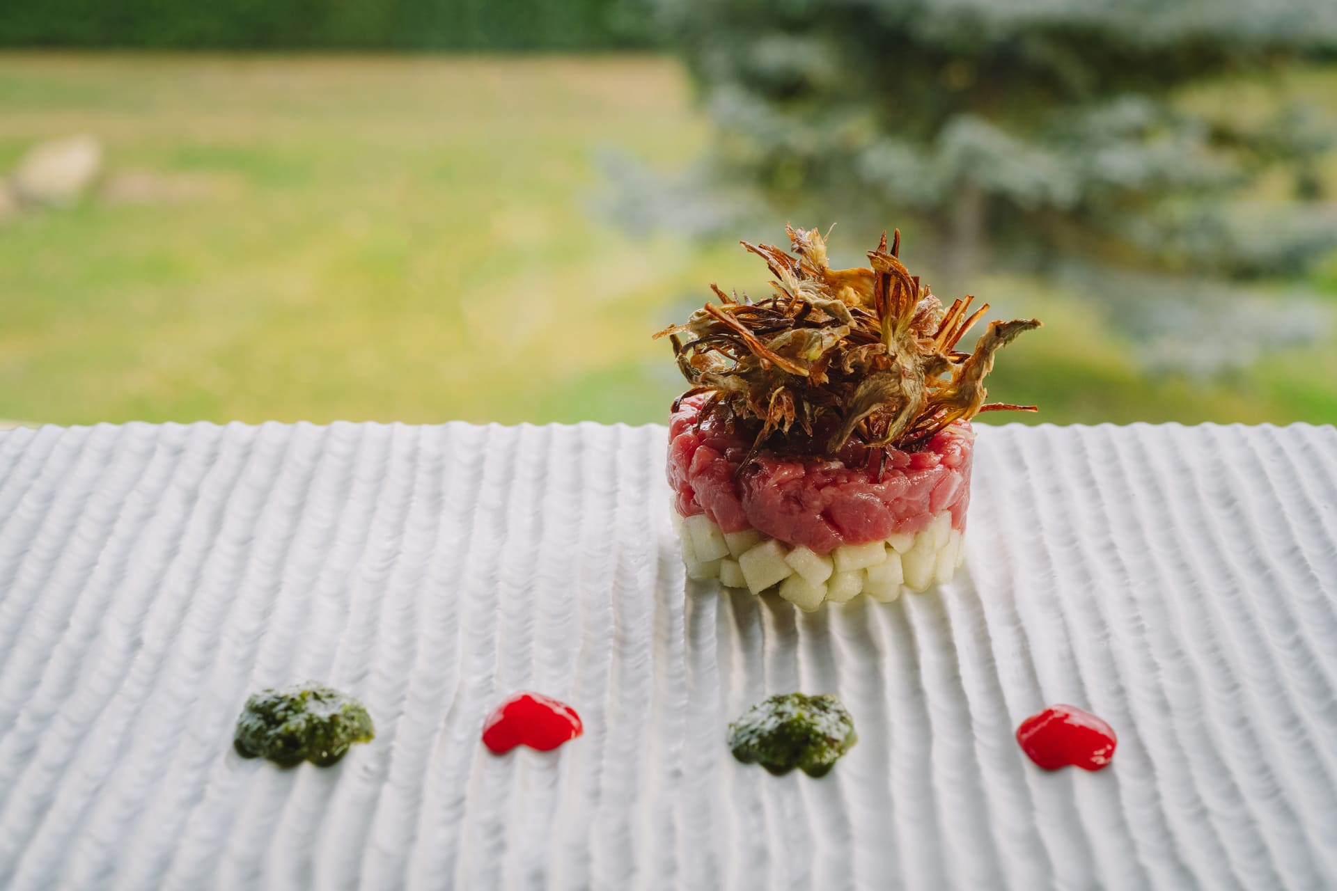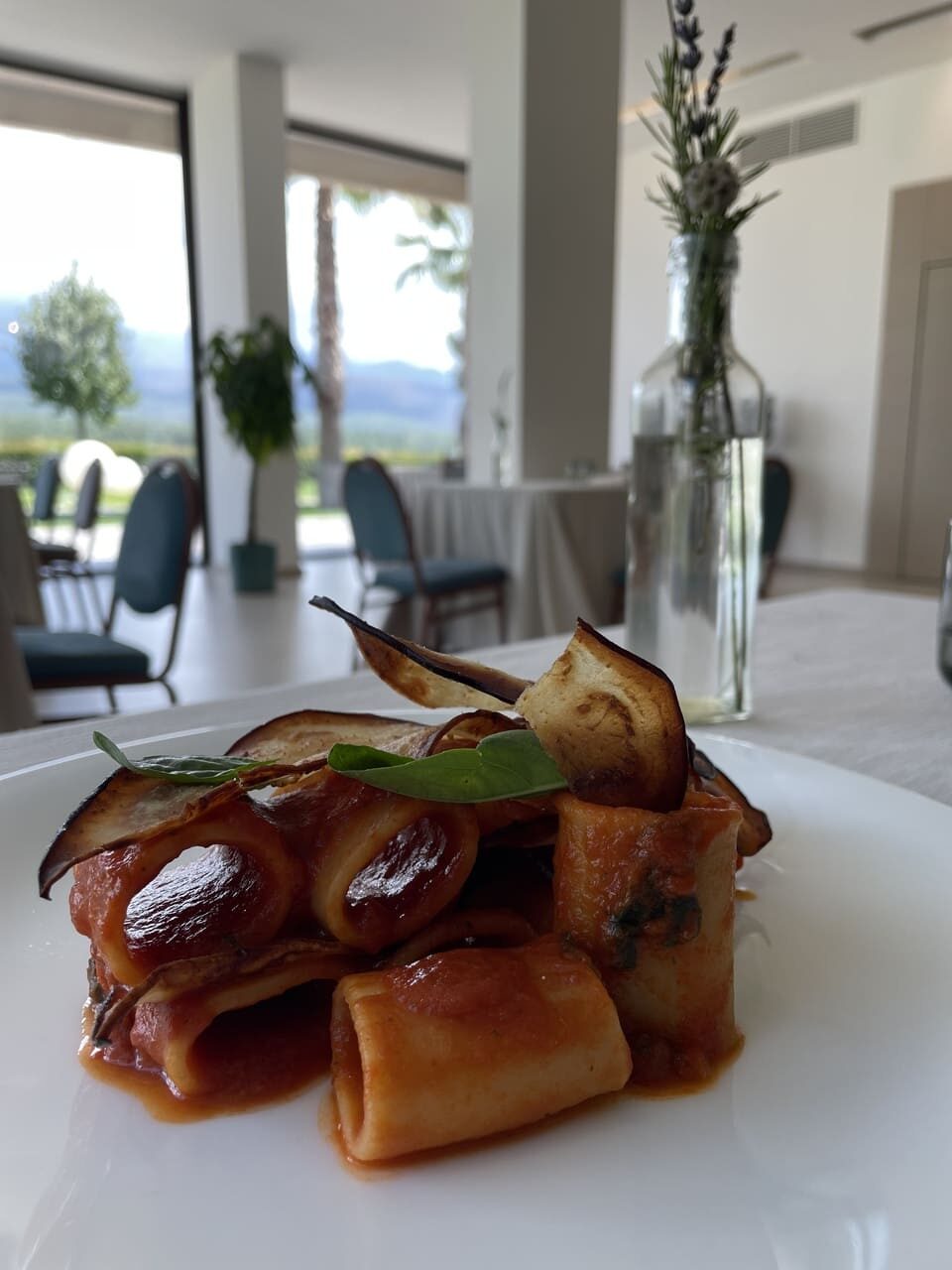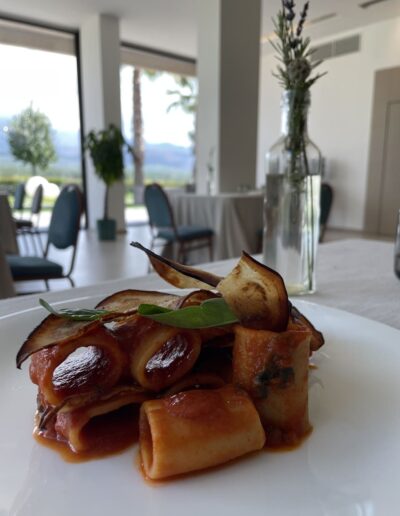 De keuken werkt uitgesproken seizoensgebonden en lokaal; denk aan Bronte-pistache, olijfolie met karakter en paddenstoelen uit de omgeving. In het fine-dining-restaurant dineer je in een stijlvolle zaal met panoramische ramen; de kaart mixt klassieke Siciliaanse smaken met moderne accenten. Uit de eigen moestuin
