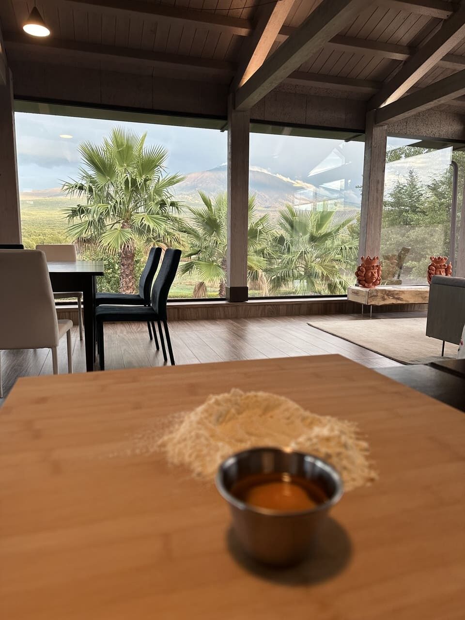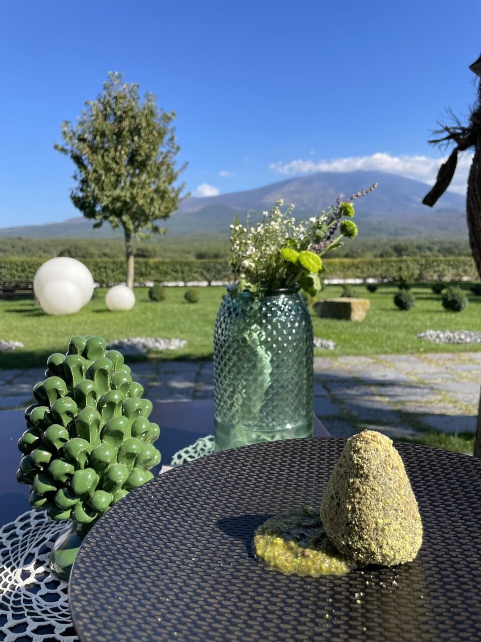 Aan de noordwestzijde van de Etna – in Bronte, hét pistache-stadje – ligt La Fucina di Vulcano. Het is een kleinschalige resort-achtige plek (slechts 9 kamers) met grote ramen richting de vulkaan, een royale tuin en een restaurant waar Etna letterlijk het decor vormt. De naam verwijst speels naar de mythische “smidse” van Vulcano en cycloop Bronte: vandaag is het een smidse van gastvrijheid en smaak.