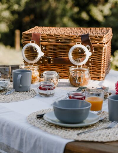 Elke ochtend staat er een picknickmand voor je klaar met lokale producten en huisgemaakte zoetigheden. Je eet waar je wilt: binnen, op het terras of in de tuin. Productkeuze is bewust en zoveel mogelijk gezond en gecertificeerd.