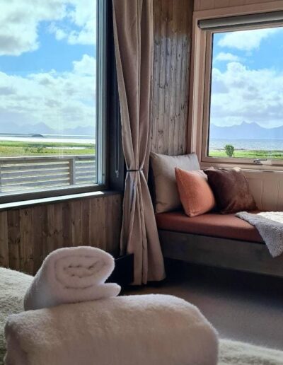 Het verblijf biedt 7 tweepersoonskamers (ontbijt inclusief), 2 cabins, een appartement en een studio (ontbijt op aanvraag). Allemaal met zeezicht of uitzicht op de weiden en bergen. Alle verblijfsruimtes hebben een privé-badkamer en volledig uitgeruste keuken of kitchenette, flatscreen-tv en gratis wifi. De kleuren in de cabins zijn subtiel en in lijn met het uitzicht uit het raam en de natuur in de omgeving.