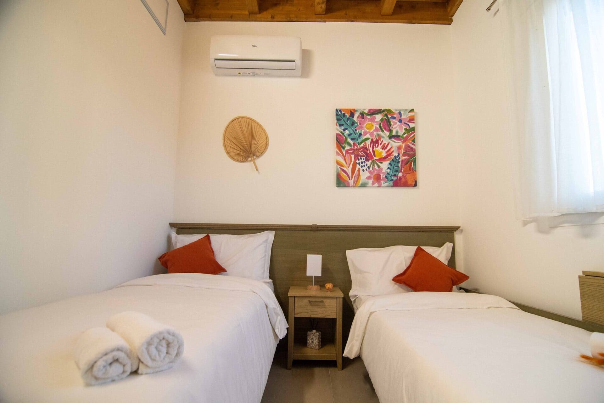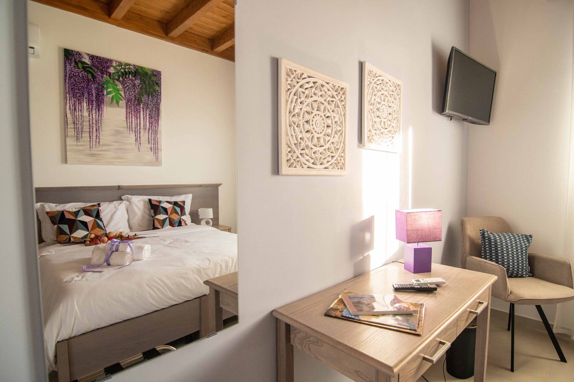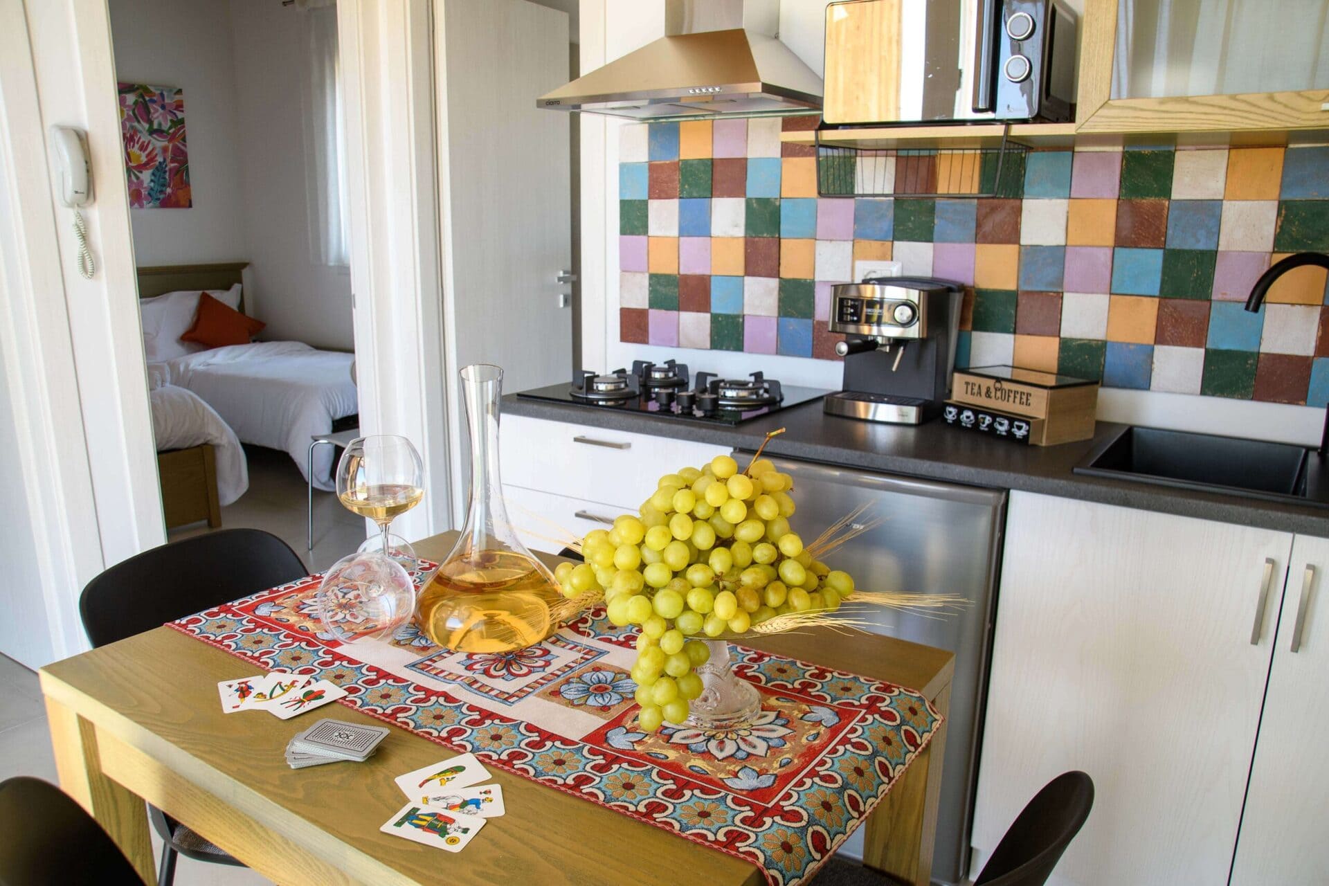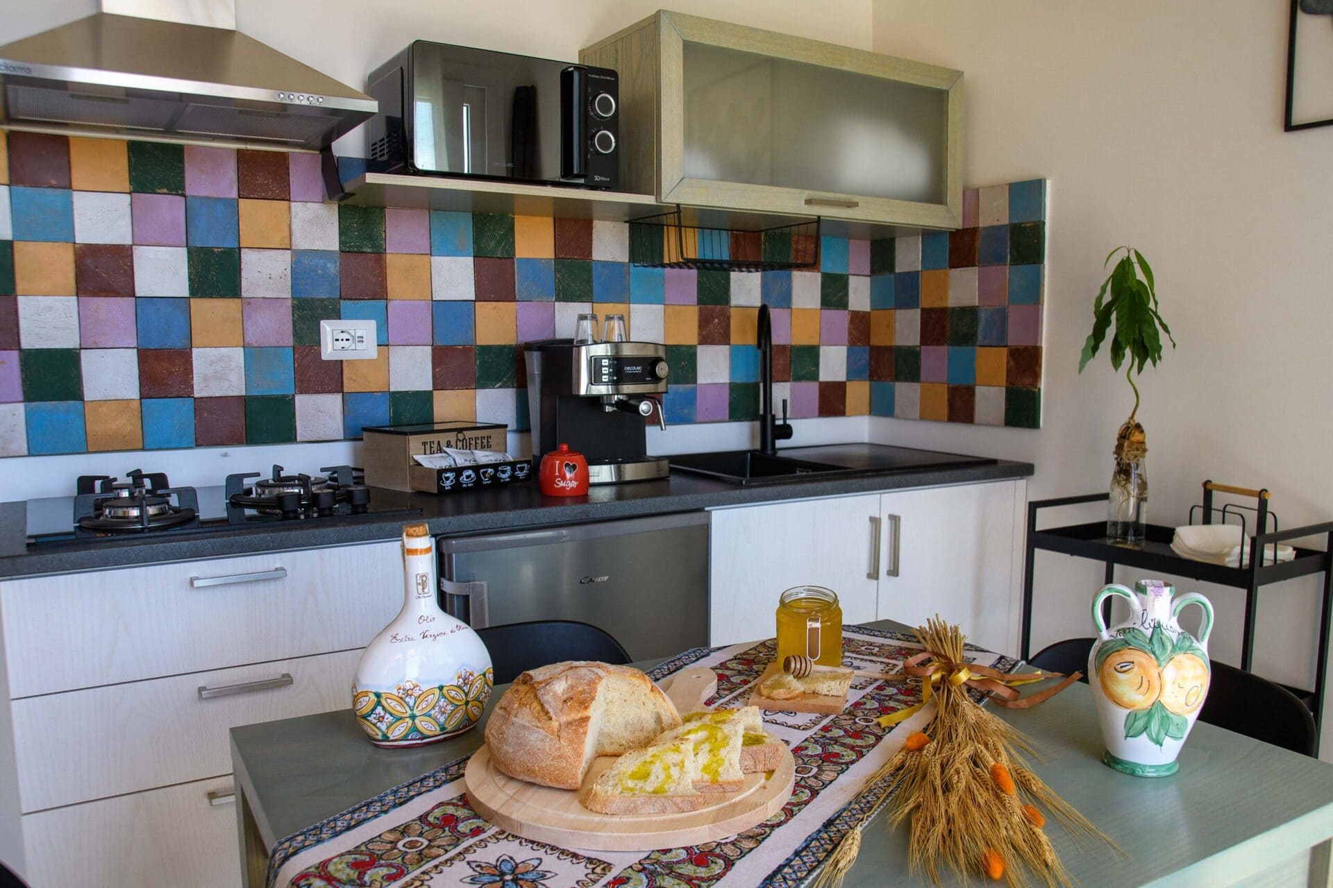 Het Siciliaans landhuis is het kloppende hart van het complex. De kamers zijn ruim en licht, met airconditioning, gratis wifi, een volledig uitgeruste keuken en eigen badkamer. De kamers hebben uitzicht op de tuin, omringd door olijf- en citrusbomen.