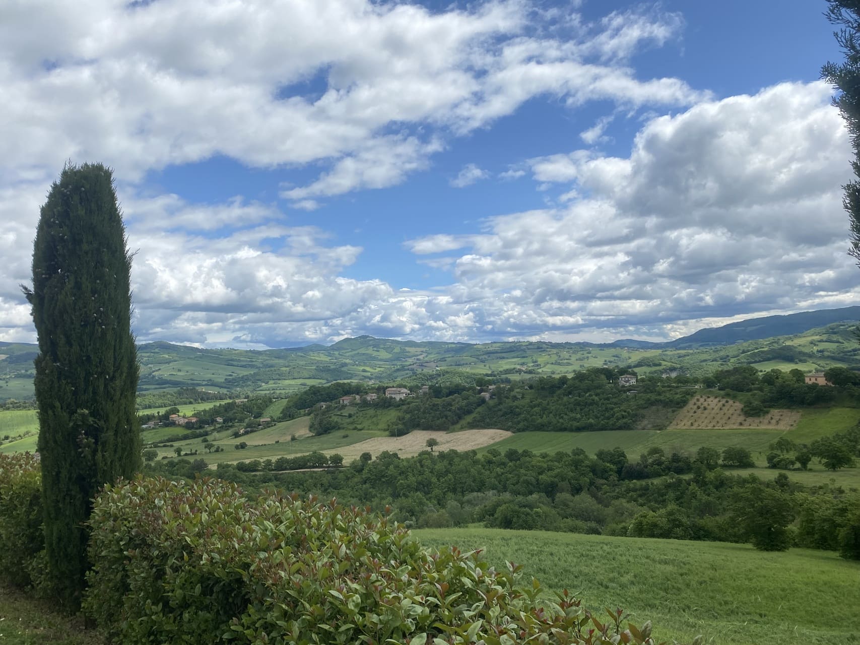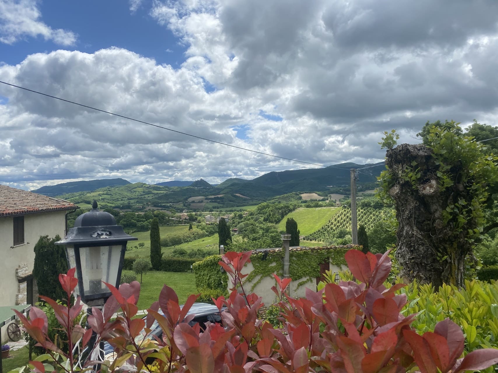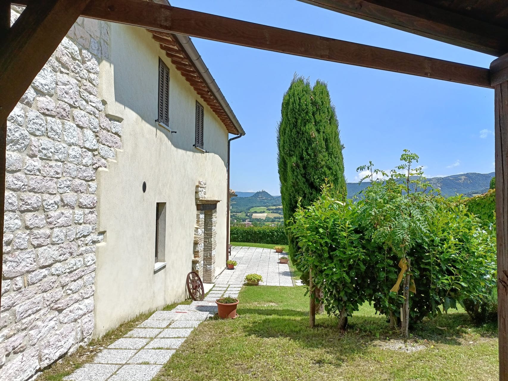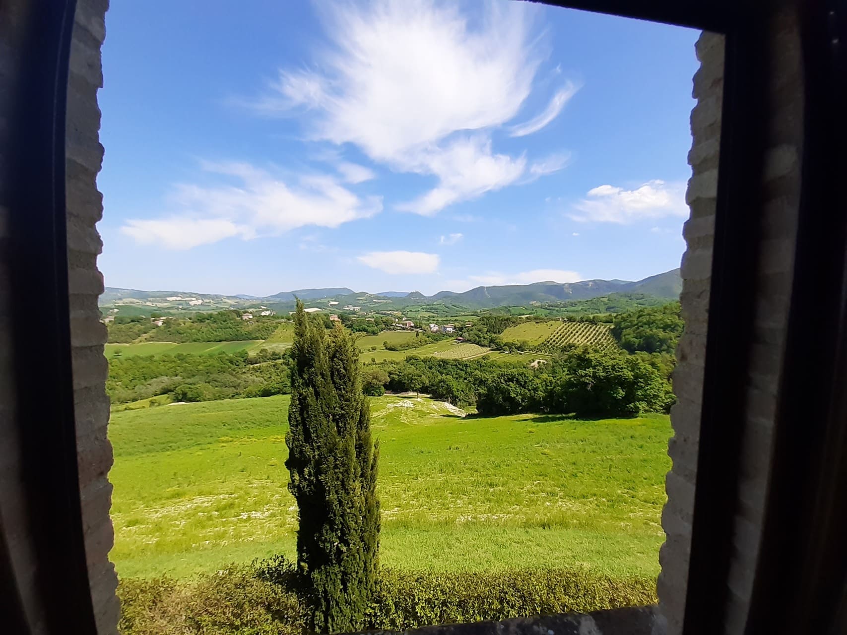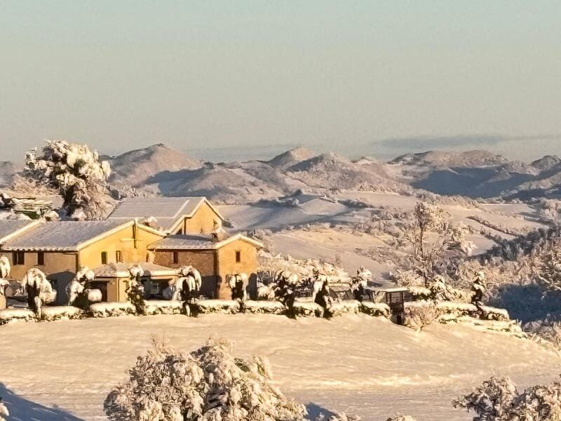 Monte Catria bepaalt hier de horizon. In elk seizoen anders: frisgroen in het voorjaar, goud in de nazomer, en in de winter soms een echt berggevoel.