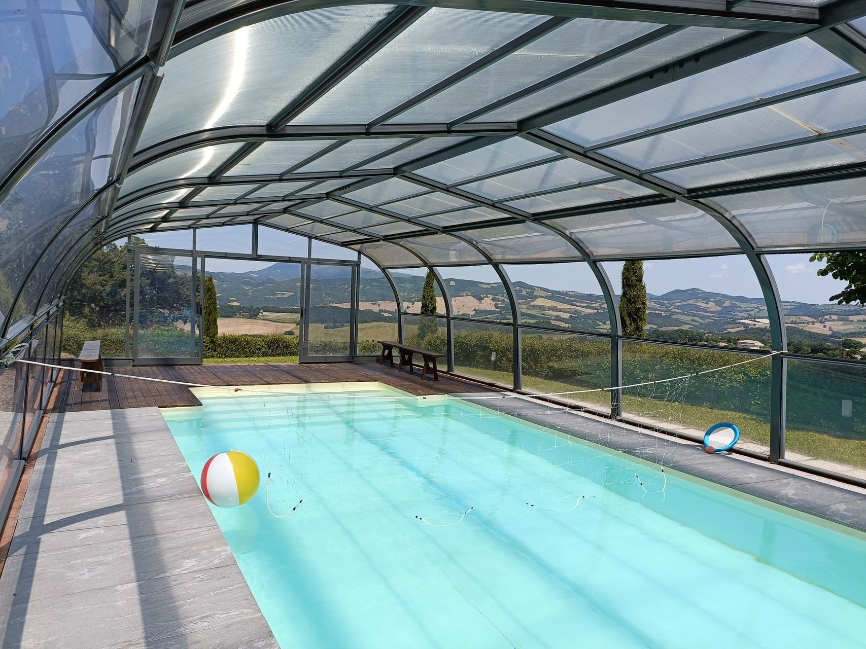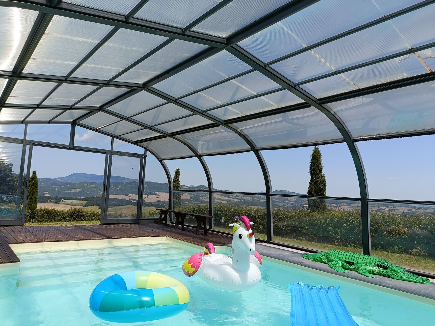 Een van de grootste verrassingen hier: het zwembad. Villa Colticciola heeft een rechthoekig, (te openen) overdekt zwembad met Romeinse trap en chromo-therapie. Bedoeld om het hele jaar door te kunnen zwemmen en ontspannen.