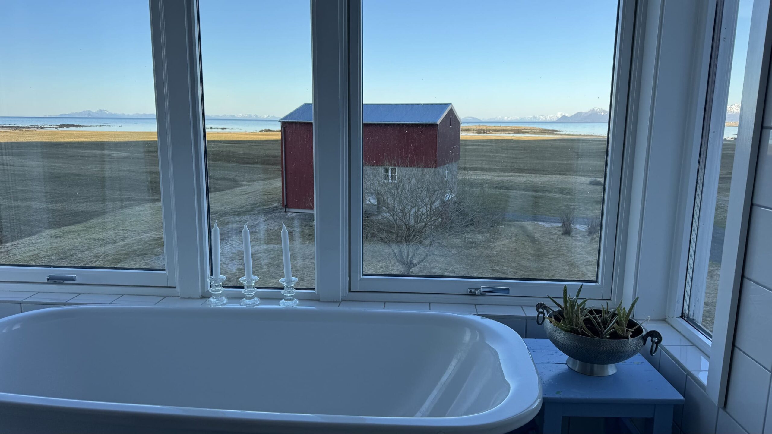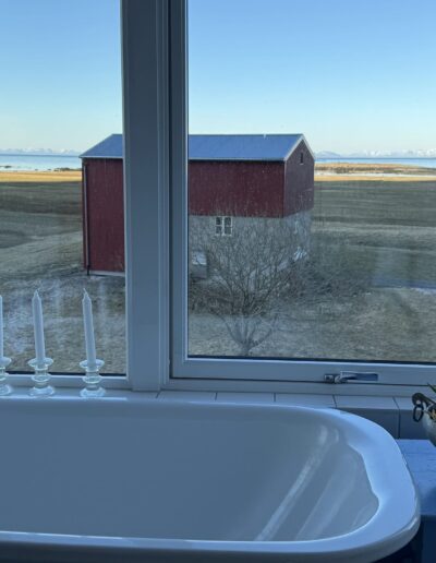 Bij de naastgelegen hoeve, op steenworp afstand van de haven. Meer ruimte, eigen keuken, open haard. Uitzicht op bergen en weiland. Het zomerse restaurant van Villa Lofoten bevindt zich hier (op reservering, lokale ingrediënten). Maximaal 4 personen.