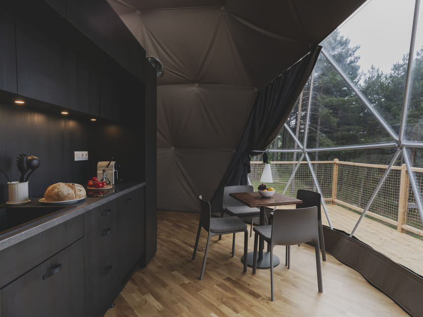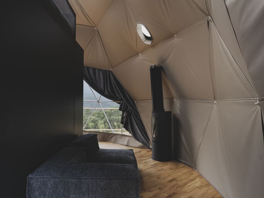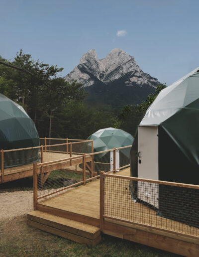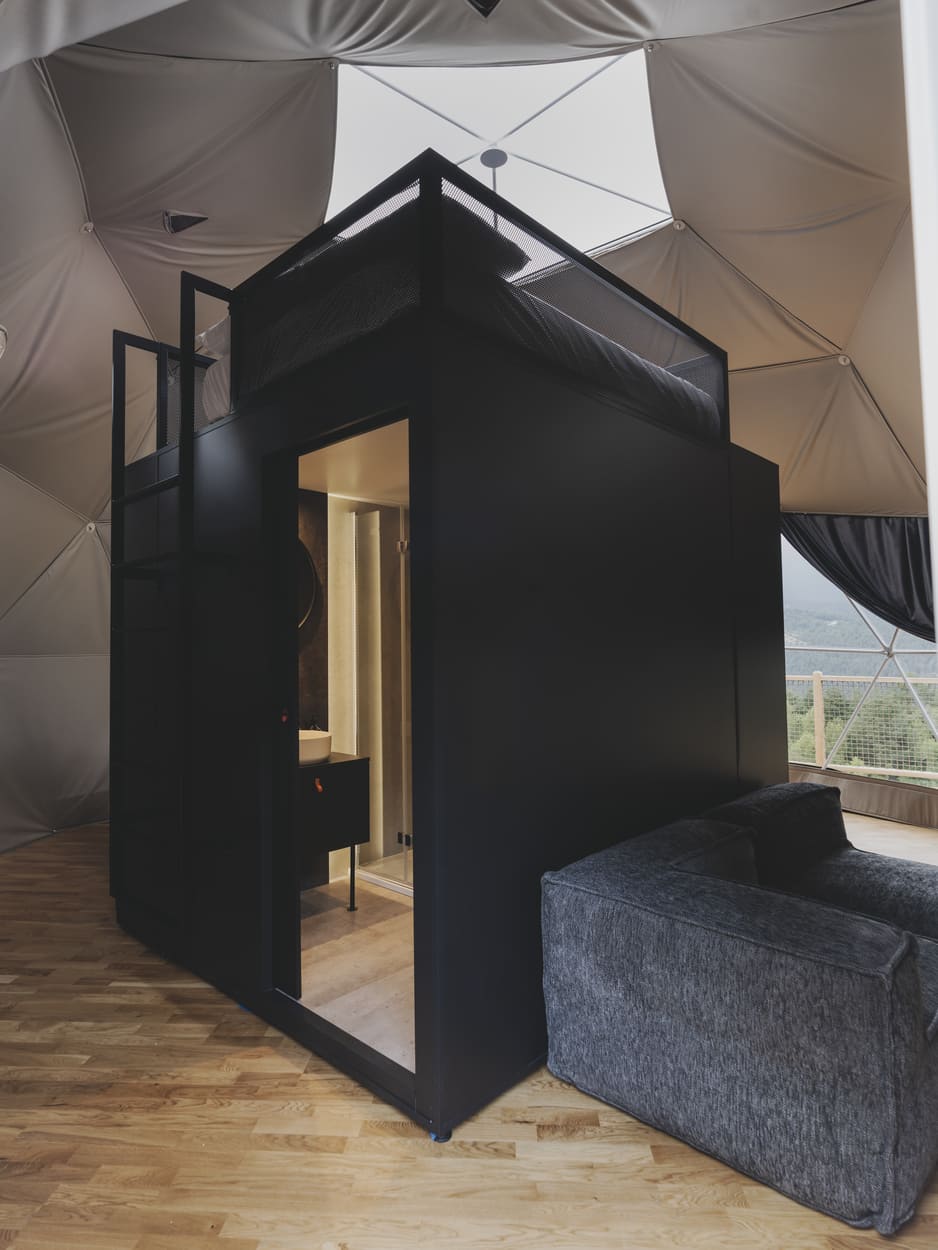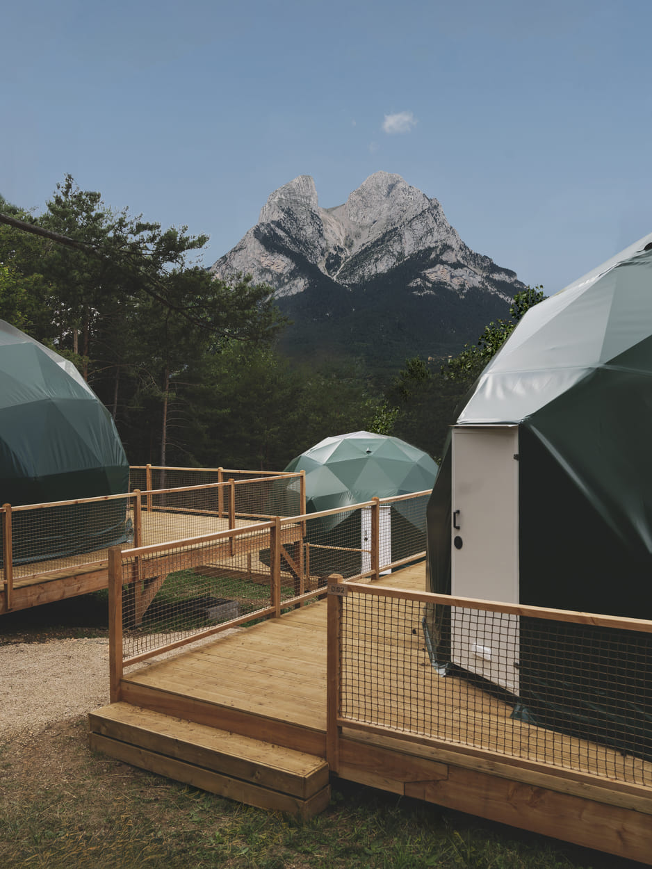 Wecamp Pedraforca heeft een breed aanbod aan huuraccommodaties: bungalows (hout en stenen), mobilhomes, bell tents en koepeltenten (domes). De domes met hun pellet-haard en panoramisch bergzicht zijn de meest bijzondere optie.